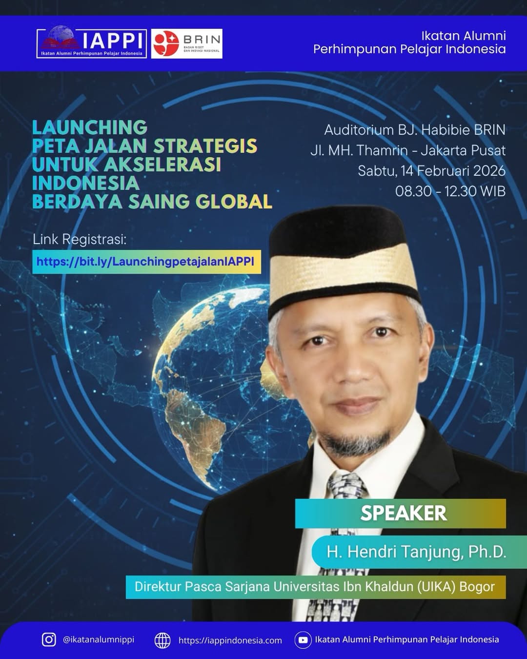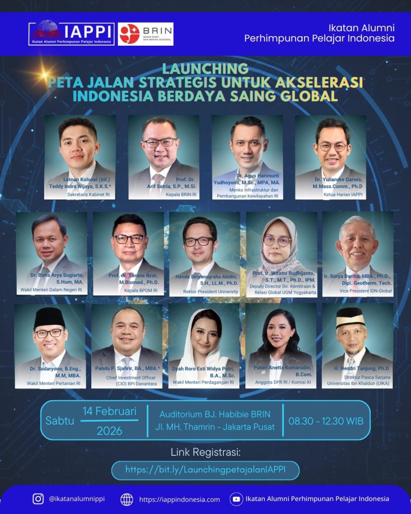 Ikatan Alumni Perhimpunan Pelajar Indonesia (IAPPI) bekerja sama dengan Badan Riset dan Inovasi Nasional (BRIN) sukses menyelenggarakan acara peluncuran “Peta Jalan Strategis untuk Akselerasi Indonesia Berdaya Saing Global” pada Sabtu, 14 Februari 2026 di Auditorium BJ. Habibie BRIN, Jakarta Pusat. Acara yang berlangsung dari pukul 08.30 hingga 12.30 WIB ini dihadiri oleh jajaran menteri, pejabat tinggi negara, akademisi, dan tokoh-tokoh berpengaruh dari berbagai sektor.