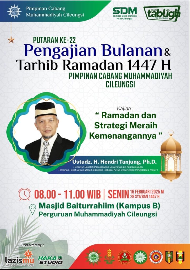 Cileungsi, 16 Februari 2025 – Pimpinan Cabang Muhammadiyah (PCM) Cileungsi menyelenggarakan Pengajian Bulanan Putaran Ke-22 sekaligus Tarhib Ramadan 1447 H, Senin (16/2), bertempat di Masjid Baiturrahiim Kampus B Perguruan Muhammadiyah Cileungsi. Kegiatan yang berlangsung pukul 08.00 hingga 11.00 WIB ini menghadirkan narasumber istimewa, Ustadz H. Hendri Tanjung, Ph.D., Direktur Sekolah Pascasarjana Universitas Ibn Khaldun Bogor sekaligus Ketua Departemen Pengelolaan Wakaf Dewan Masjid Indonesia.